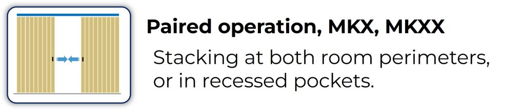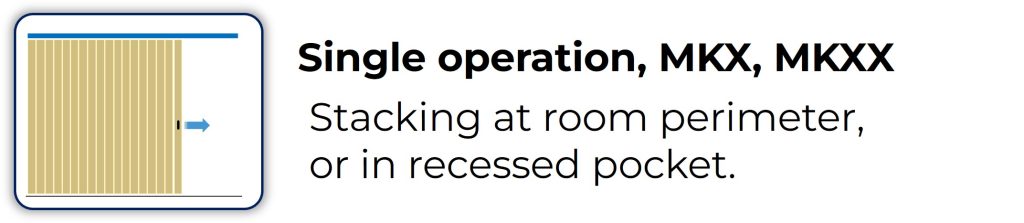 Easy to operate, support and install, and equipped with easy-grip chrome finish handles, MK Series partitions are available in stacking configurations including at room perimeter walls, in storage pockets, as equal or unequal paired configurations, and even remote stacking and storage options. Storage pockets with sliding back panels tuck the open partition away neatly when not in use.