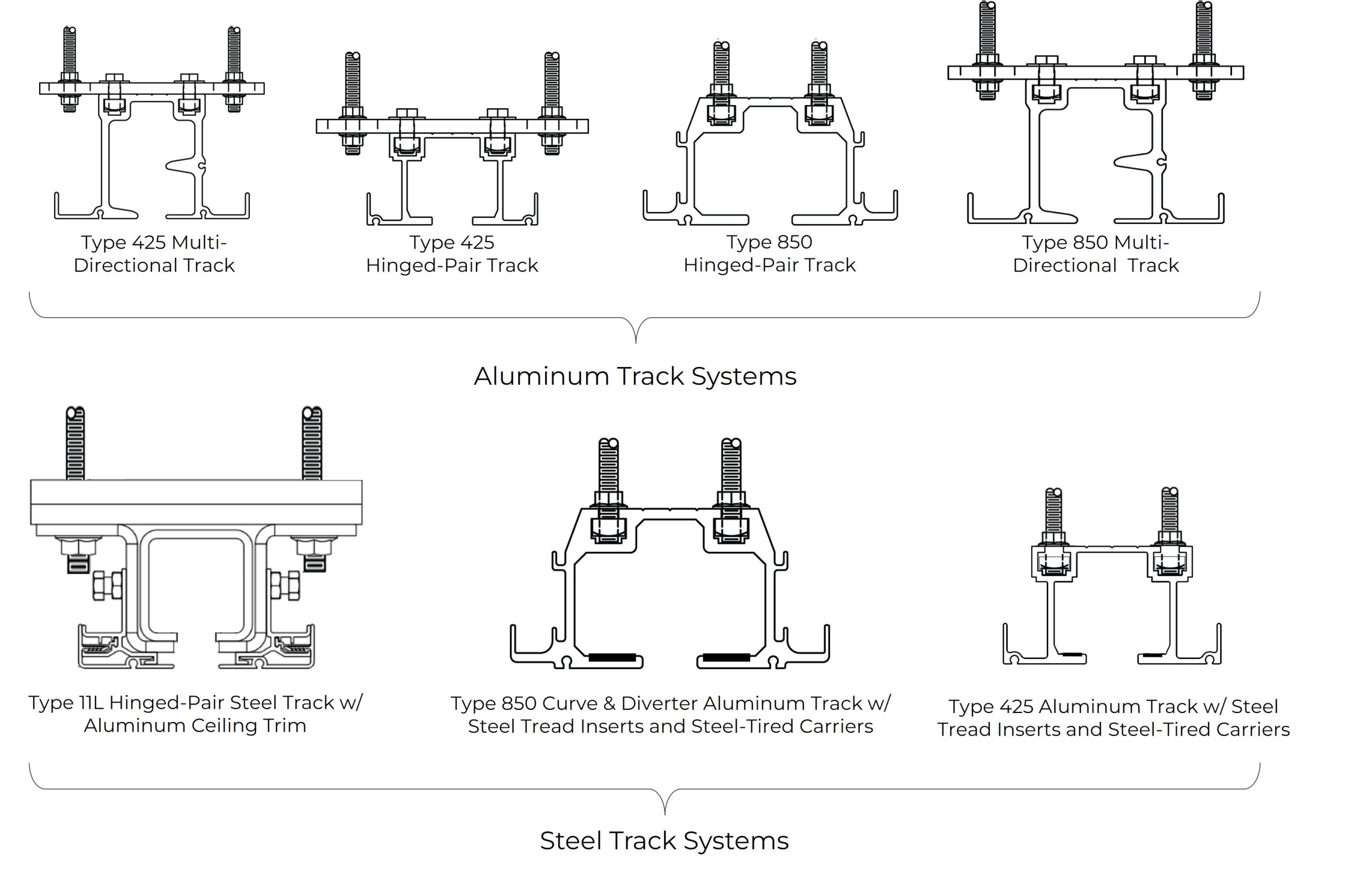 Kwik-Wall track and carrier systems are precision-engineered to support panel weights based on the STC panel construction and partition height, facilitating smooth, quiet panel operation across track joints. Type 425 and 850 clear anodized aluminum track extrusions and Type 425 and 850 Steel Track [aluminum extrusions with steel tread liner and steel wheel carriers] deliver clean, crisp lines at your track and ceiling interface.